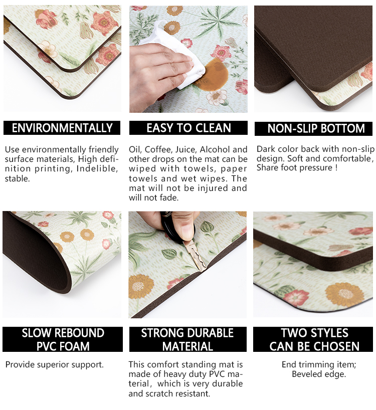 This PVC floor mat is easily cleaned. Please wipe with a damp cloth. The waterproof kitchen mats and rugs ensures long-term Non-slip and superior comfort.